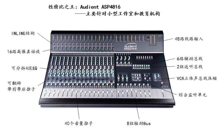 对于小型音乐工作室来说,Audient 4816是一台性价比非常高的调音台,集成了Audient 8024主要的功能(含有16路MIC/LINEIN话放、16路4段EQ均衡、监听控制、总线压缩、辅助输出、辅助Bus、同期录制乐队/合唱、可拓展5.1监听),搭配一张多通道声卡就可以轻松完成绝大部分录音/混音的工作。