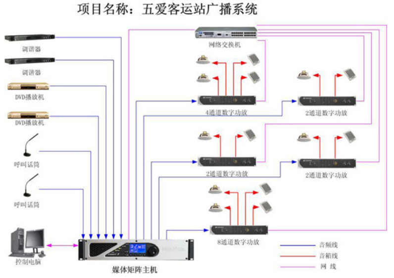 智能广播系统主要由音源、媒体矩阵主机(核心控制部分)、功放、扬声器等组成。音源部分主要包括DVD、调谐器、呼叫话筒等组成。媒体矩阵主机为核心控制部分,可完成整个音频的信号走向的设置及对整个广播系统的操作。功放采用网络化的功放,所有的功放均挂接在网络上,不同于以往的定压功放,该功放所有的音频输入信号均为cobrnet 信号,达到无损高保真传输信号的目的。采用CobraNet & DSP 接口的多通道功放。扬声器部分采用吸顶式扬声器和壁挂式扬声器。
