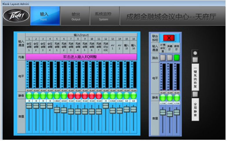 NION媒体矩阵强大的数字音频处理功能,极大的提高了语言扩声的音质,天府接待中心话筒拾音距离达到50cm以上,同时开启8只话筒都无啸叫完美反馈。