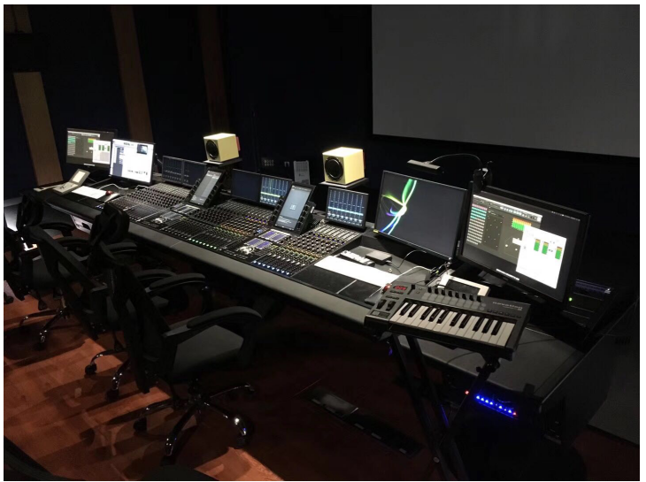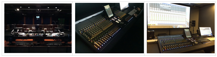 以模块化的工作站控制台AVID S6为主要控制,双工位布局,EUCON协议完成数字音频工作站的通信,通过AVID MTRX音视频矩阵/ AVID HDX运算卡等设备实现对扬声器(48只)的监听与控制。