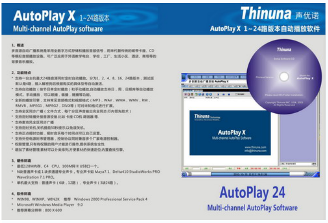 在馆内的各个展区均采用Thinuna广播系统作为背景音乐播放、展厅信息广播、人工广播。同时采用了24路AutoPlay自动播放软件(配套三块8通道专业声卡)作为自动服务器播出控制。在一些没有吊顶的区域安装HJ-20B全天候铝合金吊顶喇叭和FS-X8时刻音箱。