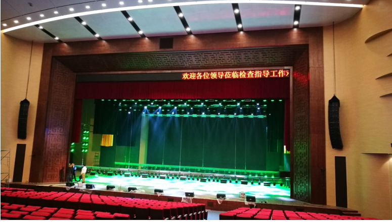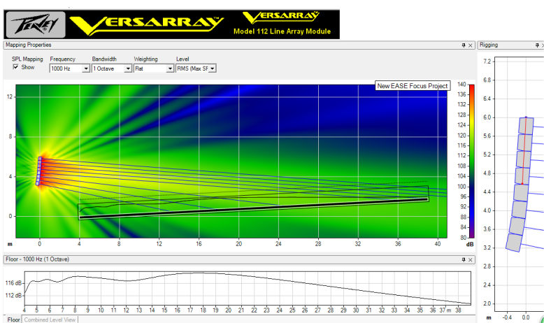 强大的Peavey线阵列扬声器系统设计软件为我们安装调试提供了强有力的指导。通过CAD模拟计算与Peavey设计软件结合现场实际出图测试,我们得出了主扩声扬声器Versarray112阵列数量为8只、吊挂高度5.3米、整体向下倾角6.7度以及阵列单元间的阵列夹角。