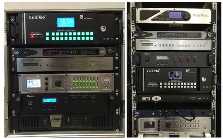 本次系统建架以美国Peavey MediaMatrix nion nX作为整个智能音视频系统的管理主机;每个房间配置1台AVMEDIA的中控主机Conet-900作为本地房间的集中控制主机;1台美国Peavey百威的数字音频处理器Digtool MX16作为本地音频处理;1台AVMEDIA的MCN2.2作为音频实现互联互通的CobarNet传输接口机;1台AVMEDIA的电源管理器MEP1000管理本地电源。